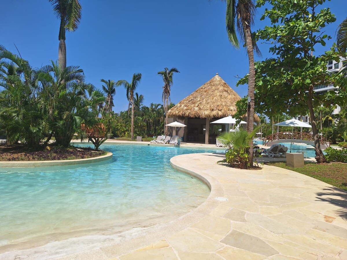 Opremljeno stanovanje za 6 oseb v stanovanjski skupnosti Mayan Lakes (Vidanta) Bazen: ležalniki v vodi, pljuskajoči bazen in območja za sončenja, tik pred stolpom. Brezplačna klubska hiša: teniška igrišča, paddle in pickle ball, telovadnica, parna soba, še en bazen, restavracija Po nakupu zapestnic na recepciji hotela Mayan boste imeli dostop do hotelske plaže, bazena Mayan Palace in otroškega vodnega parka🌴☀️. 🏡 Dve spalnici 🛁 2 kopalnici Stanovanje z zelenimi površinami, jezerom (kajak), pohodniškimi potmi