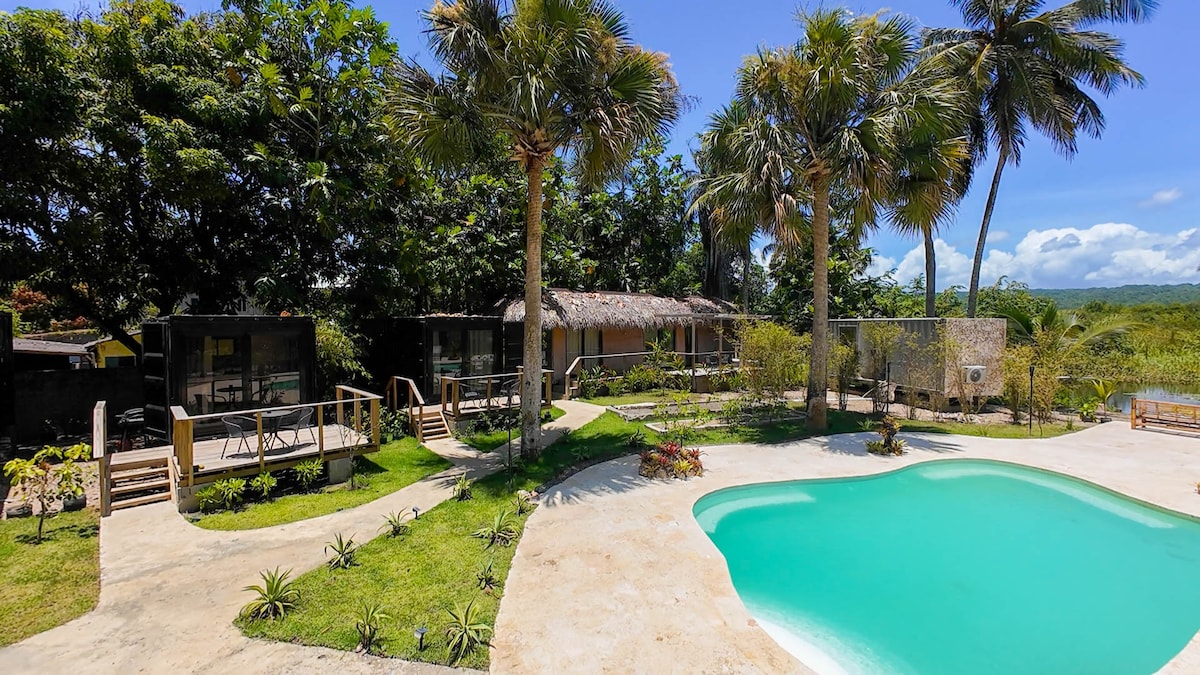 Nestled among towering trees and just 20 meters from your private entrance to the Río de Yásica, our 46 m² house offers a harmonious blend of modern comfort and natural beauty. The thoughtfully designed cubic structure maximizes space and comfort, with an open-concept layout that seamlessly integrates the bedroom, living room, kitchen, and bathroom, creating a spacious and inviting atmosphere. Large windows offer stunning views of the forest and river, connecting you to the natural world.