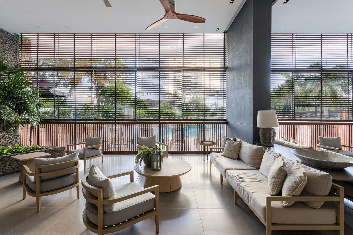 ☀️ 🏖️ 🌊 Oceanfront loft-style apartment on the 17th floor with unmatched sunset views. Enjoy a premium hotel-like experience with access to a semi-private beach and exclusive resort-style amenities: pools, jacuzzi, gym, BBQ, and coworking space. Prime location just 10 minutes from the airport. Ideal for sophisticated getaways or high-end relaxation. High-speed WiFi and a dedicated workspace, fully equipped kitchen, and a spacious private balcony with stunning ocean views.