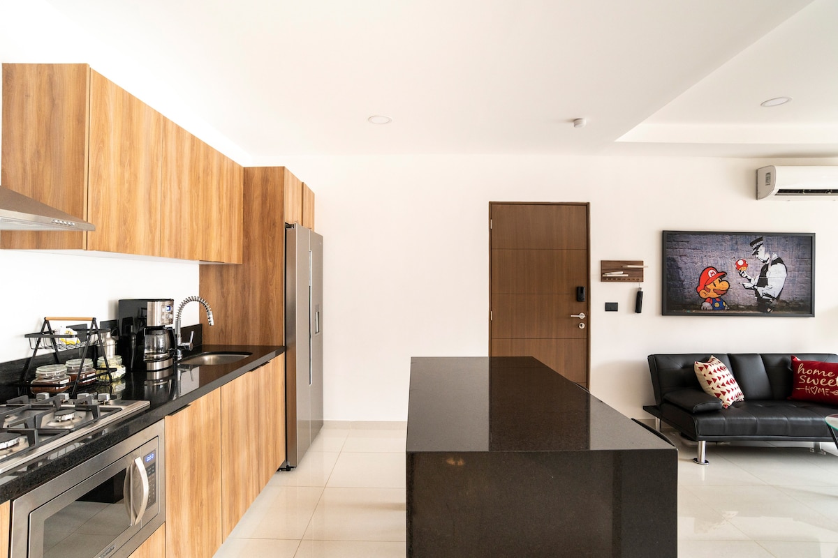 Novo stanovanje z odlično lokacijo, za 2 osebi. Ima klimatsko napravo v spalnici in TV s Chromecastom, tako da lahko poleg opremljene kuhinje in 43-palčni televizorja v dnevni sobi z Netflixom. Glavna avenija se nahaja 3 ulice in pol stran, plaža pa je oddaljena 2 ulici. Soseska je mirna in prijazna, našli boste trgovine z živili, majhno supermarket, mesnico in trgovino s tortilami.