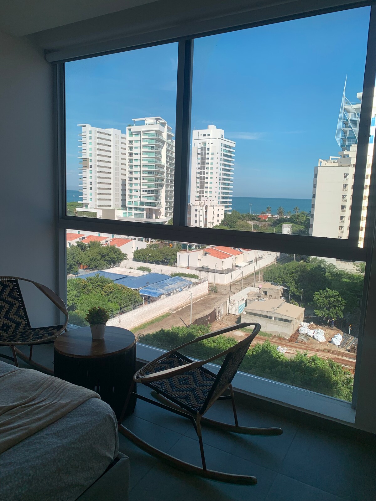 Uživajte v čudovitem razgledu na ocean iz tega sodobnega stanovanja v 11. nadstropju z vso opremo, kot so topla voda, klimatska naprava, čudovita velika okna in balkon. Stavba je sodobna in precej nova. Vaše parkirno mesto je vključeno. Nahajate se na plaži v čudovitem zalivu Santa Martha Stavba ima masažno kad, bazene za odrasle in otroke Območje je varno in ima restavracije in trgovine, vendar je mirno. ENJLOY DOBRODOŠLI ! Od februarja 2026 imamo novo kodo za Wi-Fi: 926719.