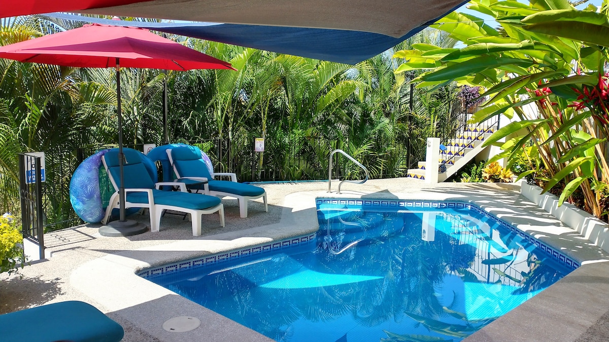 Just a short walk from the beach, Casita Rubia is our lower garden-level unit, offering a refreshed and tranquil escape in San Pancho. Recently updated with warm, modern touches, this bright one-bedroom casita sits below two new upper suites and overlooks a lush garden and shared pool. Enjoy the pool loungers or your private bistro set outside the king bedroom. A full kitchen, dining table, and fast Starlink WiFi await you—and pets are warmly welcomed!