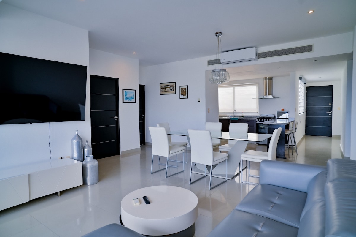 Beautiful Luxury apartment in Puerto Cancun, Hotel Zone, the most exclusive area of the city. Located with a beautiful view of the turquoise blue waters of the Caribbean Sea. Decorated in every detail, your stay will be very pleasant. It has all the necessary services, private parking, access with code and an enviable location! the condominium is connected to the Marina Puerto Cancun Shopping Center and you can walk down to find restaurants, shops, entertainment, etc.