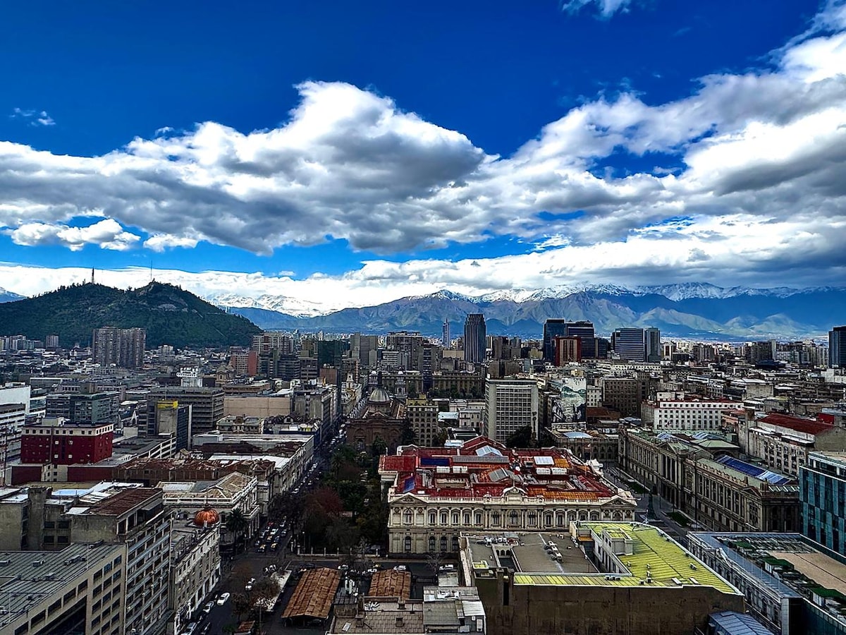 Nepremagljiva lokacija v središču Santiaga, sodni sektor in stopnice od podzemne železnice. Brezplačen in privilegiran razgled na gorovje! Dvoposteljna soba + udoben raztegljiv kavč za tretjega gosta. Ponujamo vam: Klimatska naprava, okna s termostatom, velika terasa, garderobna omara, Wi-Fi, kabelska televizija, opremljena in neodvisna kuhinja, sušilnik za lase, likalnik in še več. NE vključuje: kopalnih brisač, mreže na terasi ali parkirišča. Stavba ima pralnico s plačilom. Veselimo se srečanja z vami.