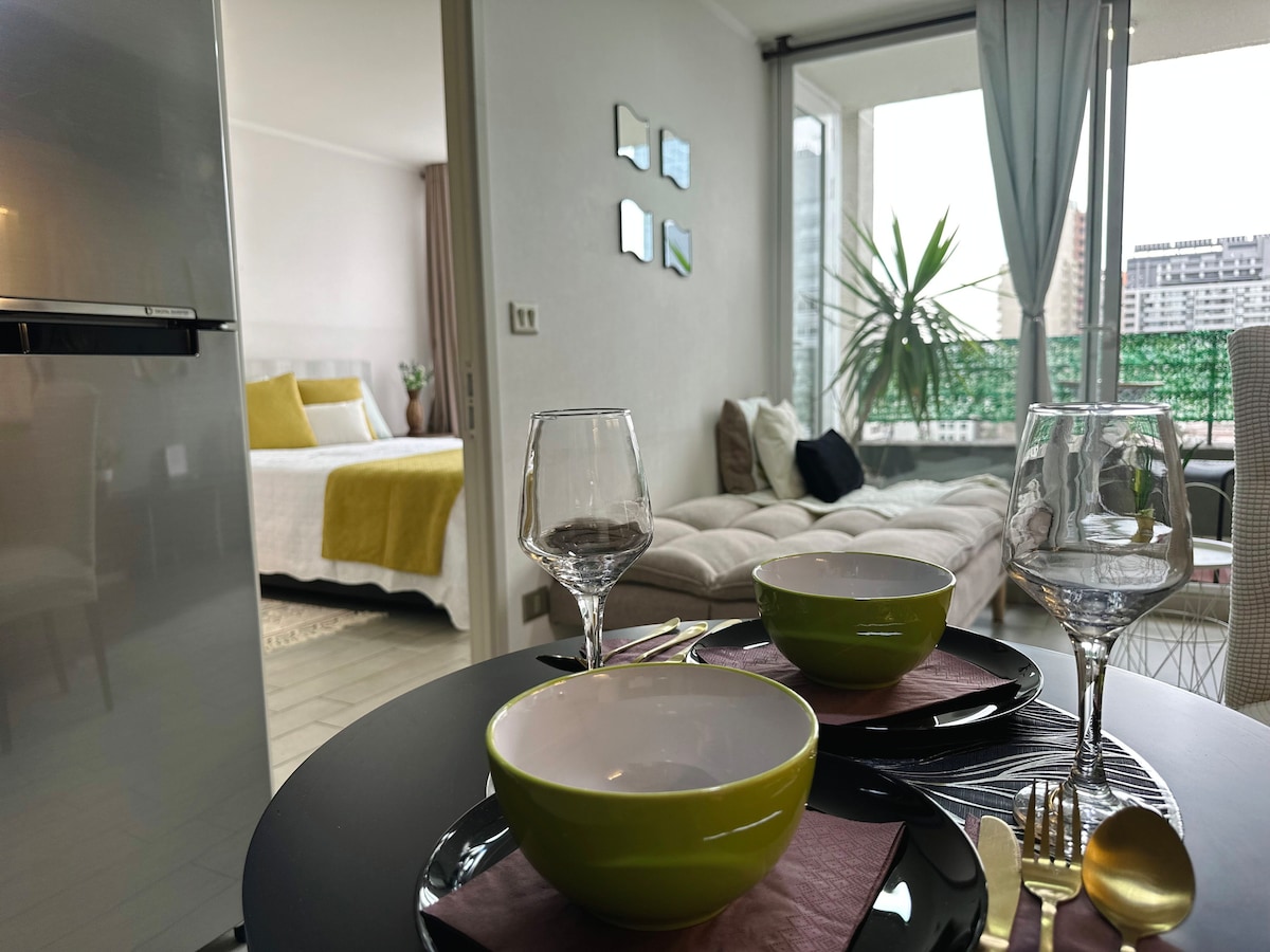 Zaljubite se v naše garsonjersko stanovanje v bližini zgodovinskega središča Santiaga, ki je zasnovano v barvah južnega Čila. Uživajte v vsem udobju tega mirnega in popolnoma opremljenega prenočišča, da bo vaše bivanje čim bolj udobno. Nekaj minut hoje od linije podzemne železnice 5 (5 min) in linije 1 (8 minut), da se boste lažje premikali po mestu. Garsonjera z 1 sobo, 1 kopalnico in teraso Če potrebujete parkirno mesto, vam lahko najamemo eno v sklopu stavbe.