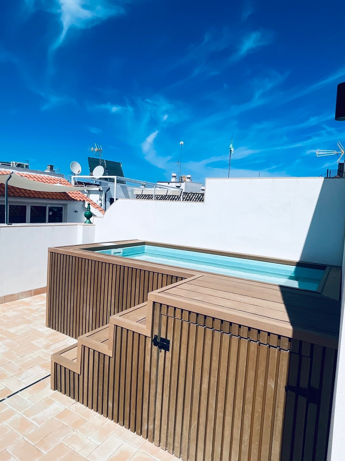 Sodoben dupleks z bazenom v Centro Histórico. Zmogljivost za šest oseb. V pritličju je dnevna soba z integrirano kuhinjo in izhodom na teraso, kjer se nahaja bazen (ki si ga deli pet nadstropij), ločena spalnica in kopalnica z WC-jem. Zgoraj je ločena spalnica, kopalnica z WC-jem in odprtim predelanim prostorom z okni na ulici, ki leti nad kuhinjo s pogledom na bazen, kjer je poleg delovne mize zakonska postelja.
