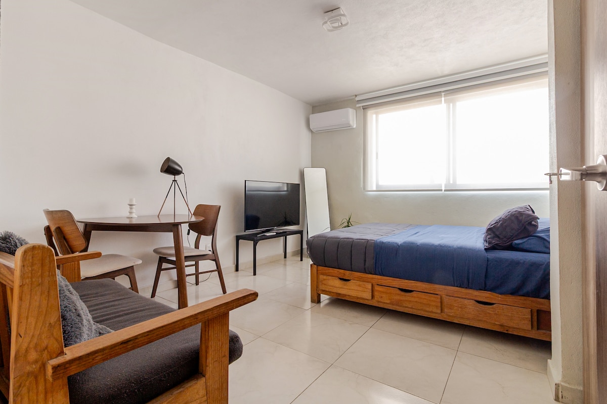 Odkrijte inovativno suito z industrijskim dizajnom v pomorskih posodah, edinstven predlog v Mehiki. Uživajte v vsej opremi, vključno s klimatsko napravo, parkiriščem, osupljivim razgledom na mesto in enostavnim dostopom do glavnih destinacij. Vse, kar potrebujete, je le kratek sprehod stran. Idealno za poslovna potovanja ali potovanja v veselje.