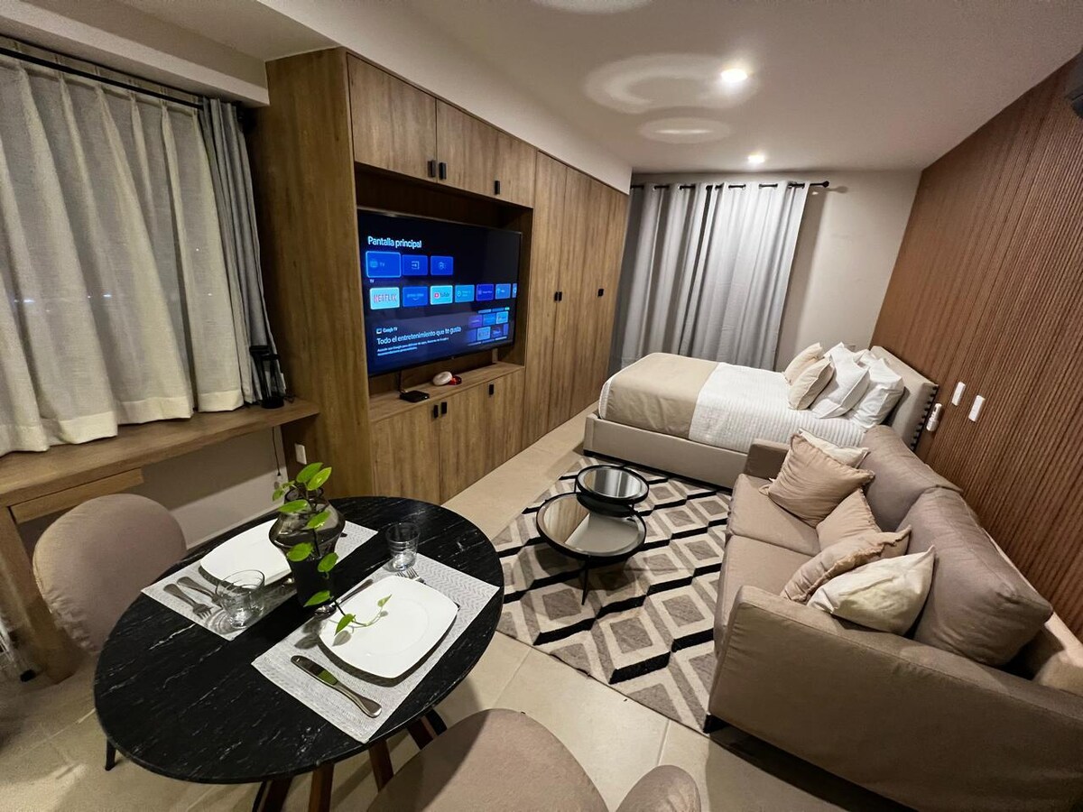 To bivališče se nahaja na izjemni lokaciji, nasproti nakupovalnega središča Plaza Mayor. Zelo blizu bolnišnic Ángeles in Medica Campestre, restavracij, bank, kavarn, kinodvoran, parka Metropolitan, Walmart, Sam's, HEB, Costco. Oddelek ima * 65-palčni Google Smart TV s 160 kanali * Visokohitrostni Wi-Fi * Opremljena kuhinja * Močno polje * Klimatska naprava * Vodni filter * Balkon Stavba ima * Telovadnica. * Bazen (v teku) * Poslovni center * Parkiranje