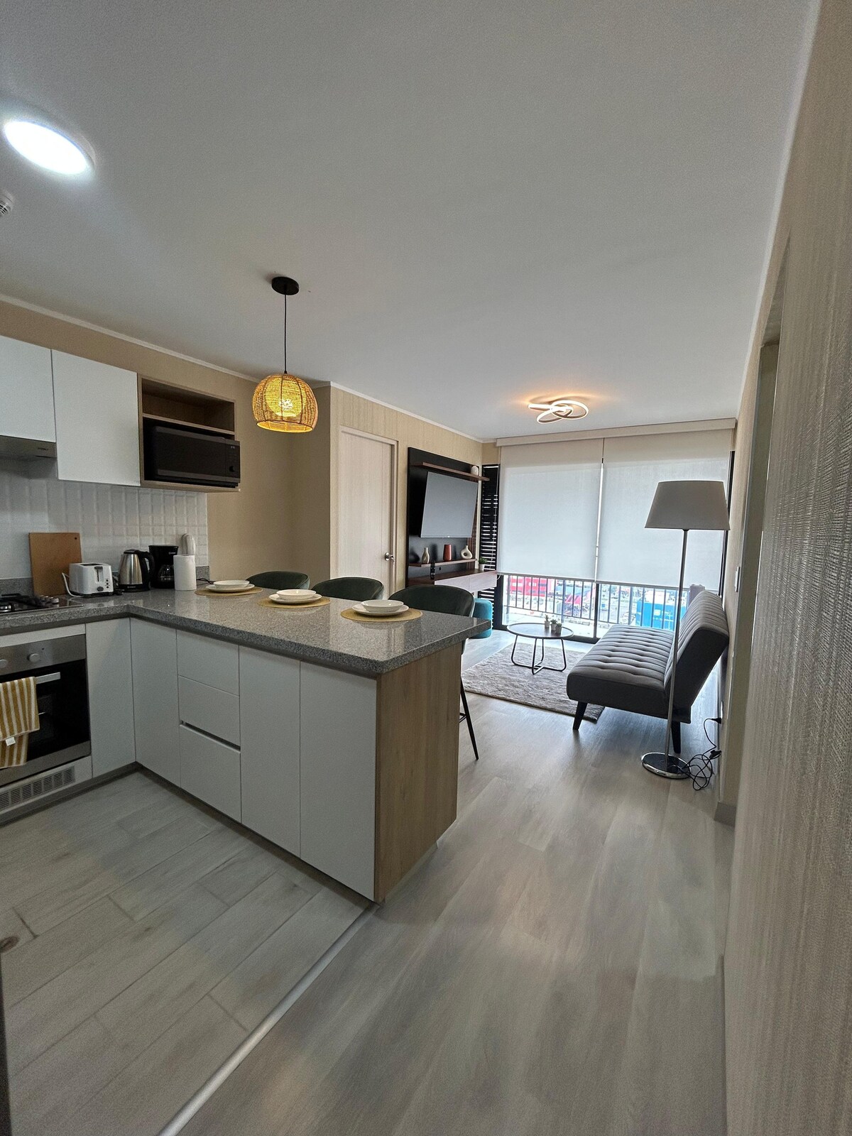 Modern fully furnished apartment, ideal for long stays. Features high-speed Wi-Fi, a 65” Smart TV with Netflix and Disney+, a fully equipped kitchen with espresso machine and water filter, washer-dryer, Double bed, and a balcony. The building offers a swimming pool, gym, and coworking area. 24/7 self check-in, smartkey, free parking, and 24-hour security. Strategically located in San Miguel, close to universities and shopping centers, and less than 20 minutes from the airport.