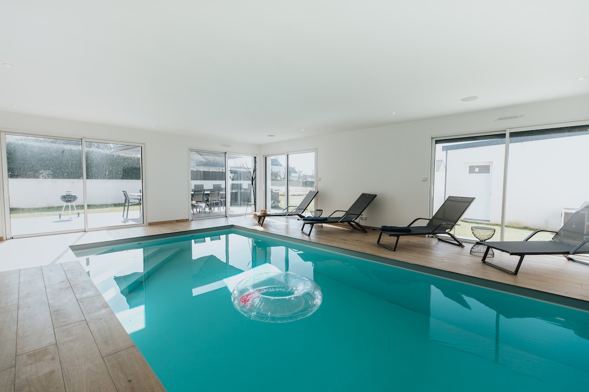 Dobrodošli v Ty Glazik, sodobni in prostorni vili v bližini plaž in pristanišča Portsall. Ogrevan notranji bazen, velik vrt, 4 spalnice s 4 zasebnimi kopalnicami, igriščem za balinanje, prostor za sprostitev in delo na daljavo... vse je zasnovano za zelo udobne počitnice za družine ali prijatelje, poleti in pozimi. 👥 Do 8 odraslih in 2 otroka 🛌 4 spalnice | 6 postelj 🛁 4 kopalnice 🏊♀️ Notranji ogrevani bazen 📍 500 m od plaž in 800 m od pristanišča Portsall