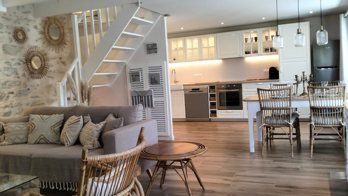 Hiša se nahaja v mirni slepi ulici. Parkirišče. Udobna, netipična notranjost. Idealno za bivanje z družino. Prostorna dnevna soba. 2 spalnici in medetaža (soba 3 na fotografijah). Kuhinjski prostor. Kopalnica. Zunanji tuš. Terasa in vrt, obrnjen proti jugozahodu. 3 km od plaže, do tja se lahko sprehodite po poteh in stezah, ob reki in nato po GR34. Čiščenje opravijo gostje ob odhodu. Bivanje < 4 nočitve: zahteva se pavšalna cena za posteljnino in brisače.