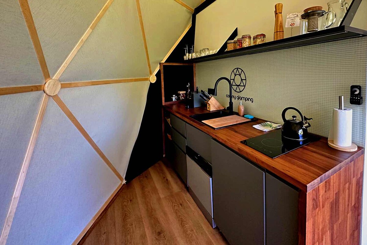 This cozy all year glamping dome retreat with floor heating offers a unique combination of comfort and privacy with modern amenities. Enjoy the luxury of a constantly heated pool up to 40°C all year round and a Finnish sauna with a picturesque view of the stream, the Finnish sauna is ready in just 45 minutes for your exclusive use. Complete equipment, it is fully at your disposal. Colony glamping is the perfect escape for those looking for peace and relaxation in the middle of nature.