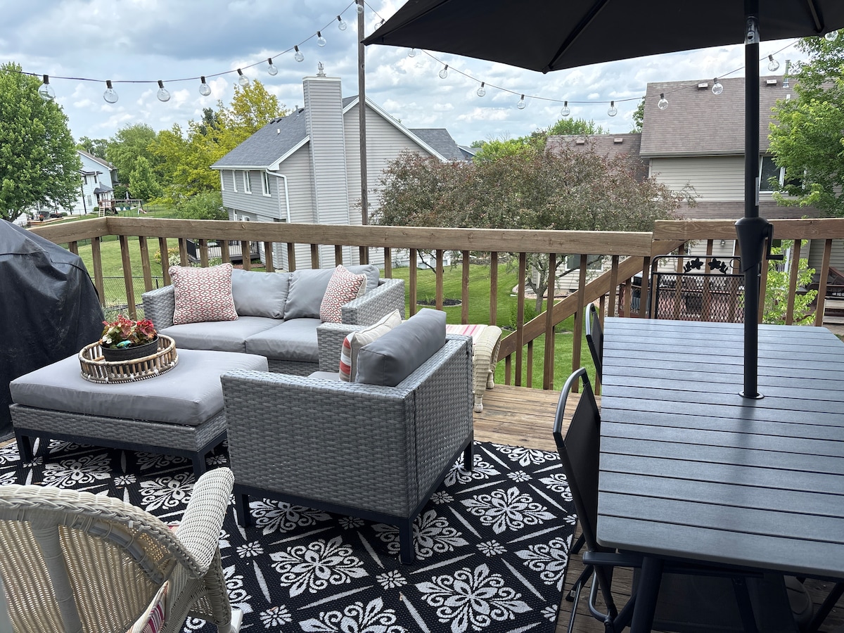 Čudovito prenovljeno kletno stanovanje se nahaja v mirni soseski v bližini I-35. Na novo prenovljeno stanovanje ima polno kuhinjo s hladilnikom, štedilnikom, mikrovalovno pečico, pomivalnim strojem, aparatom za kavo in osnovnimi potrebščinami za kuhanje. Uživajte v električnem kaminu v dnevni sobi. Velika spalnica ima udobno zakonsko posteljo in veliko garderobno omaro. Dnevna postelja z dvema ločenima posteljama je v družinski sobi. Pack-n-play je na voljo. Uživajte v bazenu/mizi za namizni tenis in televizorju. Blizu javnega igrišča za golf.