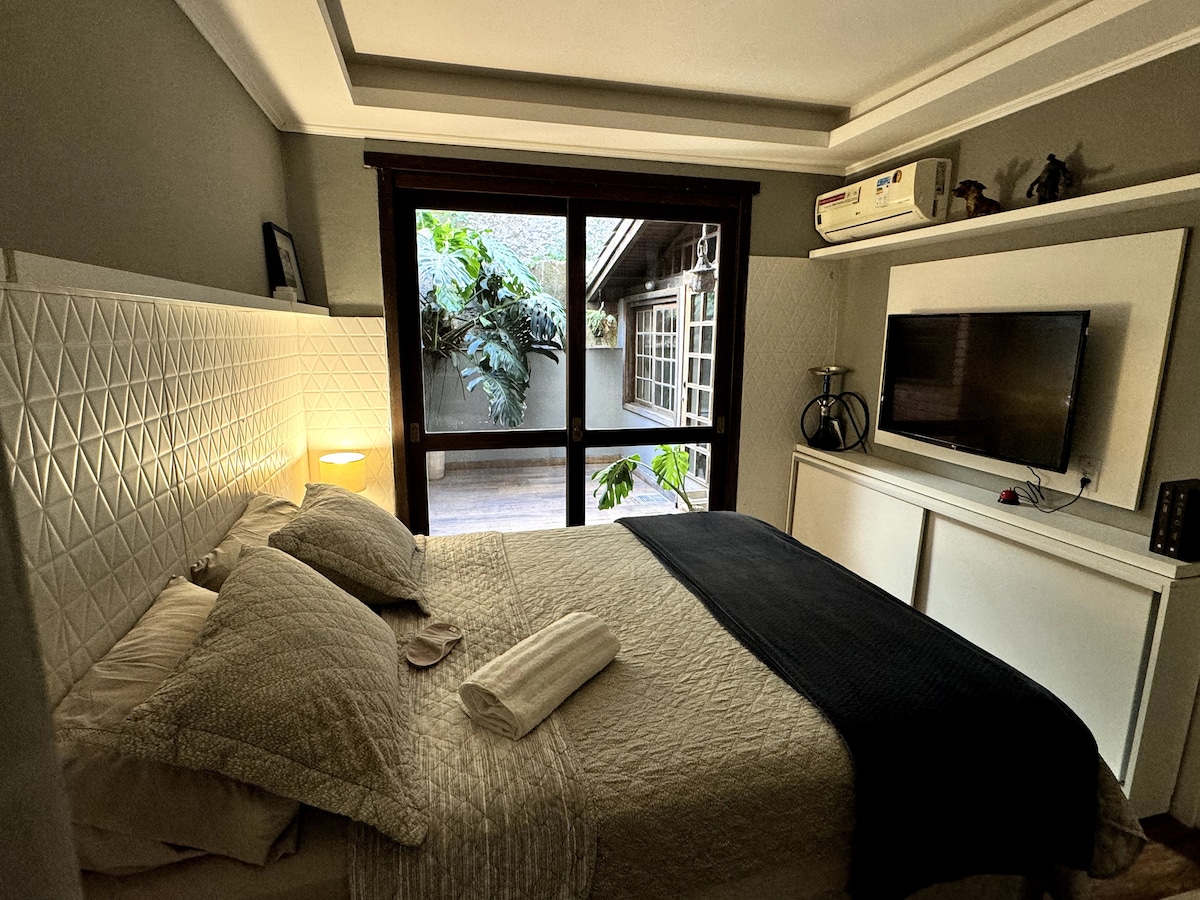 Čudovit vrt Alto Padrão na privilegirani lokaciji na najvišji točki Porto Alegra. Sprejme do 4 osebe. Sprejemamo majhne/srednje velike hišne ljubljenčke. Ima popolnoma opremljeno kuhinjo, zakonsko posteljo z vzglavnikom, 2 enojni vzmetnici, super svetlo kopalnico z odlično prho. Na balkonu je miza, 2 stola, 1 ležalnik, senčniki. V ceno je vključeno garažno mesto, z možnostjo drugega parkirnega mesta (glejte strošek).