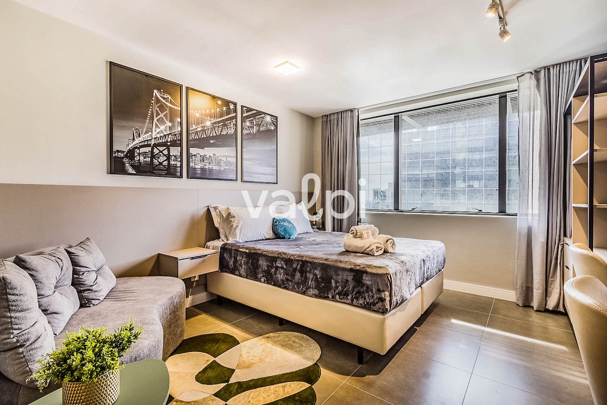 Garsonjera s pogledom na park in avtomatizacijo/Alexa. Zaprta garaža, kuhinja z osnovnimi potrebščinami in posteljnina/kopalna posteljnina. Nahaja se v osrednjem predelu, na strehi z bazenom, telovadnico in coworkingom. Parque da Redenção je le nekaj metrov stran, ekološki sejem in Brique ob vikendih, gastronomija Refúgio do Lago in predstave v avditoriju Araújo Vianna. Blizu barov, restavracij in nočnega življenja v soseski Cidade Baixa/Bom Fim. Enostaven dostop do Orla do Guaíba, univerz, bolnišnic in drugih sosesk.