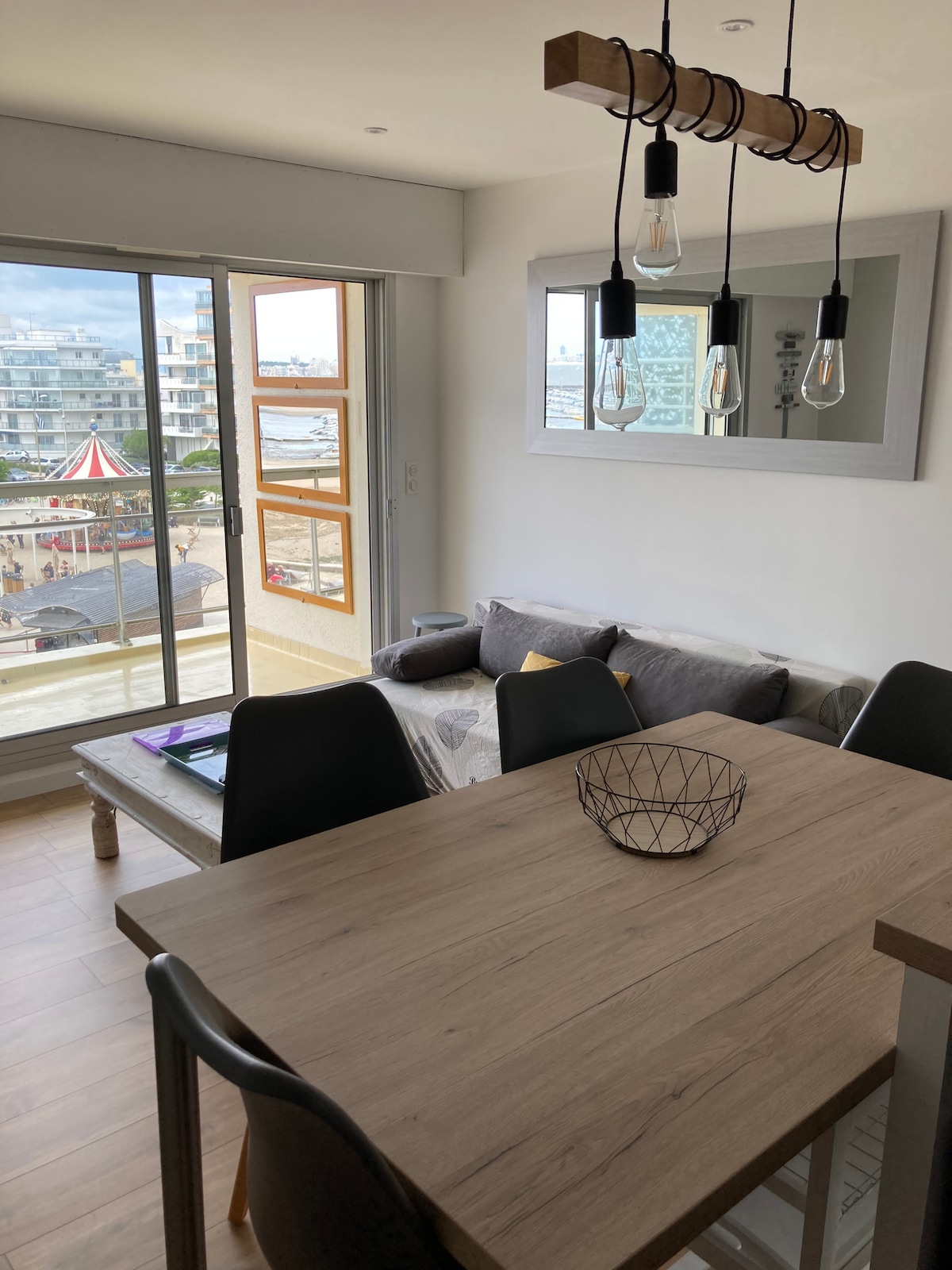 Pornichet: T2 cocooning face mer Appartement de 40 m2 situé au RDC d'une résidence de standing sécurisée, avec terrasse de 11 m2, pouvant accueillir jusqu'à 6 personnes. Le logement comprend 1 chambre avec 1 lit de 160, 1 entrée cabine avec 2 lits superposés et dans le séjour 1 convertible de 140. Salle de bain et WC séparés. Cuisine entièrement équipée. Logement refait à neuf. Emplacement idéal, proche des restaurants, clubs de plage, casino, Thalasso, commerces, marché, etc...