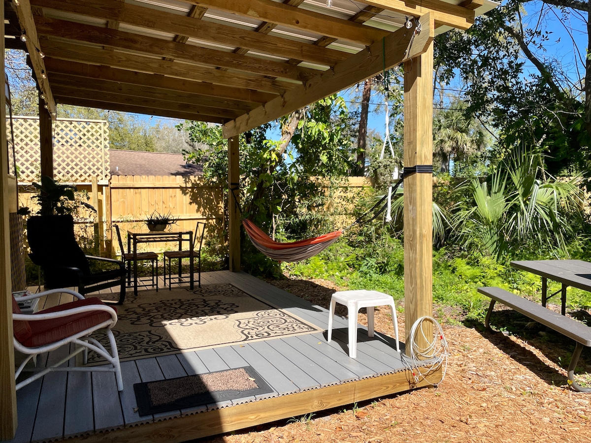 Prenočišče meri 1600 kvadratnih metrov, vaše prenočišče pa meri 335 kvadratnih metrov, zasebno in udobno!!! Ima spalnico, dnevno sobo in kopalnico. Parkirišče je pod nadstreškom za tiste tropske deževne dni ( parkirajte na desni strani). To je skupni prostor. Obstajata dva pametna televizija, ki imata Netflix, tubi, YouTube in druge. kuhinjska niša ima keurig, hladilnik kompaktne velikosti in mikrovalovno pečico. imamo stole/ brisače za plažo, zunanjo prho, toplo in hladno vodo. *mačke v sklopu namestitve!!! *kuža po imenu Lucy *starost 21 let ali več