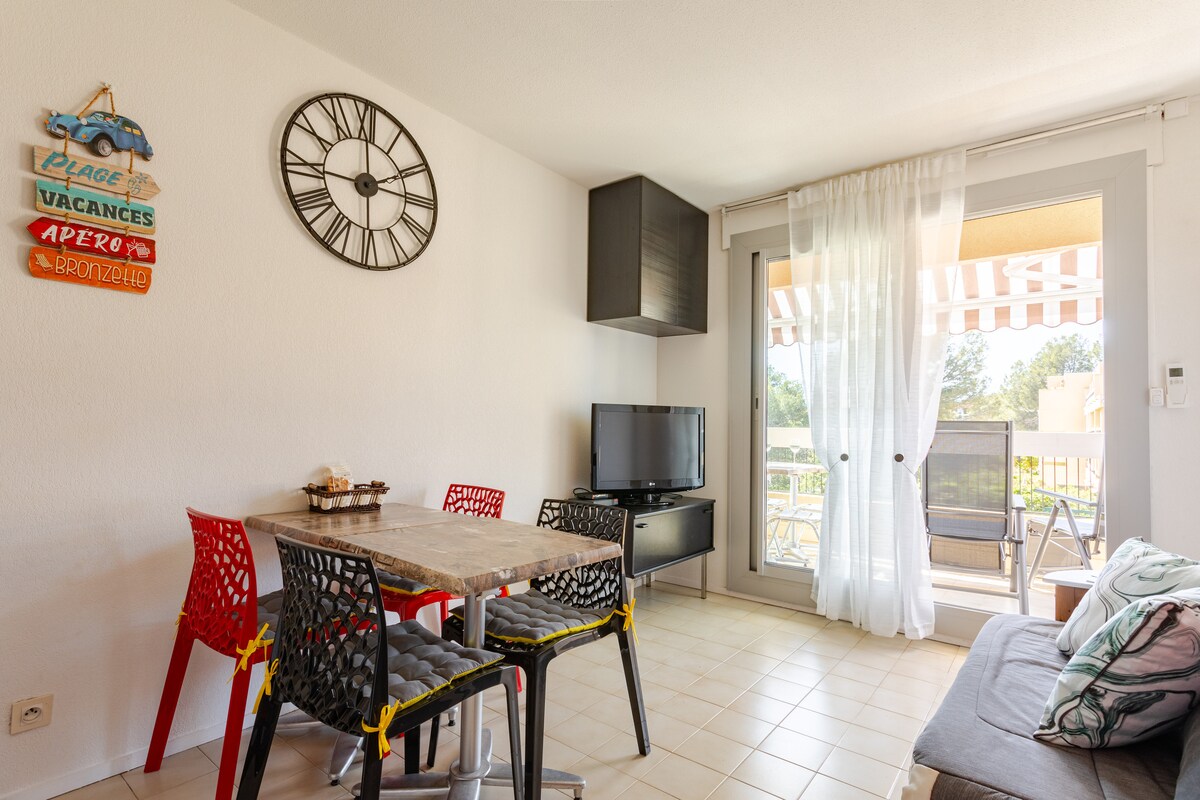 30 m2 klimatizirana garsonjera z vrtom v soseski Boulouris v St-Raphaëlu 🌴 V mirni in zeleni rezidenci, prenovljeni garsonjeri in na popolni lokaciji! 2-minutni sprehod do plaže Turtle Beach; idealno za potapljanje z masko. 10 minut hoje od plaže Peguiere, ki je primerna za plavanje pod nadzorom. 250 m od trgovin, restavracij in železniške postaje Boulouris (ter), ki služi celotni obali in Italiji. 160 x 200 m raztegljiva postelja Ni primerno PMR
