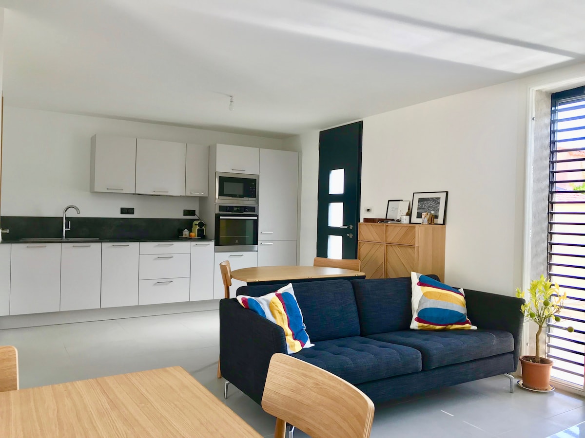 Pobegnite na osupljivo modro obalo in doživite Provanso v garsonjeri, ki so jo skrbno zasnovali lastniki arhitektov. Zbudite se ob osupljivem razgledu na hrib in morje z vaše zasebne terase in uživajte v vsem sodobnem udobju. Sprehodite se do peščene plaže in raziščite zalive z brezplačnim morskim kajakom. Priročno je oddaljen 10 minut od lokalne železniške postaje in 25 minut od letališča Marseille z brezplačnim parkiranjem. Na modri obali Provanse vas čaka nepozabna pustolovščina!
