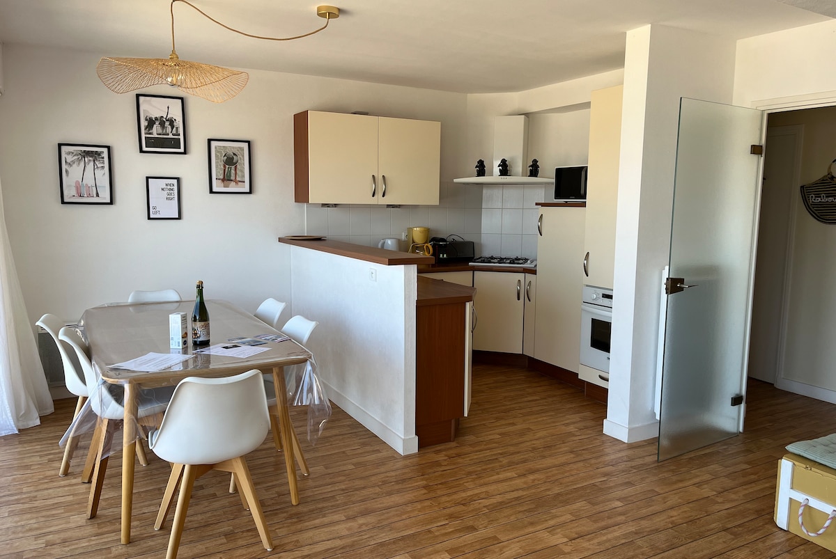Right in the heart of Quiberon, everything within walking distance. Cozy 50m² apartment in a quiet setting, featuring a lovely south-facing terrace overlooking the main beach. Large living room/kitchen, bedroom with king-size bed, shower room, separate WC. Fully equipped kitchen with dishwasher, oven, microwave, washing machine, Nespresso, Airfryer, Terrace with outdoor table and sun loungers. Electric awning. Private parking. TV, HiFi radio, internet. Bedding included for stays of 7 nights mini