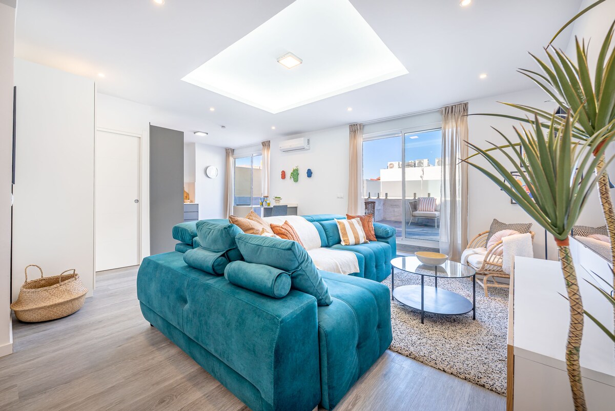 PENTHOUSE v središču! Spektakularno popolnoma novo oblikovalsko podstrešno stanovanje s površino 50 m2 in teraso s pogledom na morje, ki meri 25 m2. Nahaja se v osrčju soseske Soho, ki je bila pred kratkim prenovljena, z oblikovalskimi detajli in dobrim okusom. Idealno za pare, skupine prijateljev in družine. V 10. nadstropju in brez hrupa se boste znašli ob vsem. Le 7 minut od C/Lariosa in 10 minut od plaž. Idealno za sprehod do vseh zanimivosti. SmartTV, Wi-Fi in neobvezno parkiranje.
