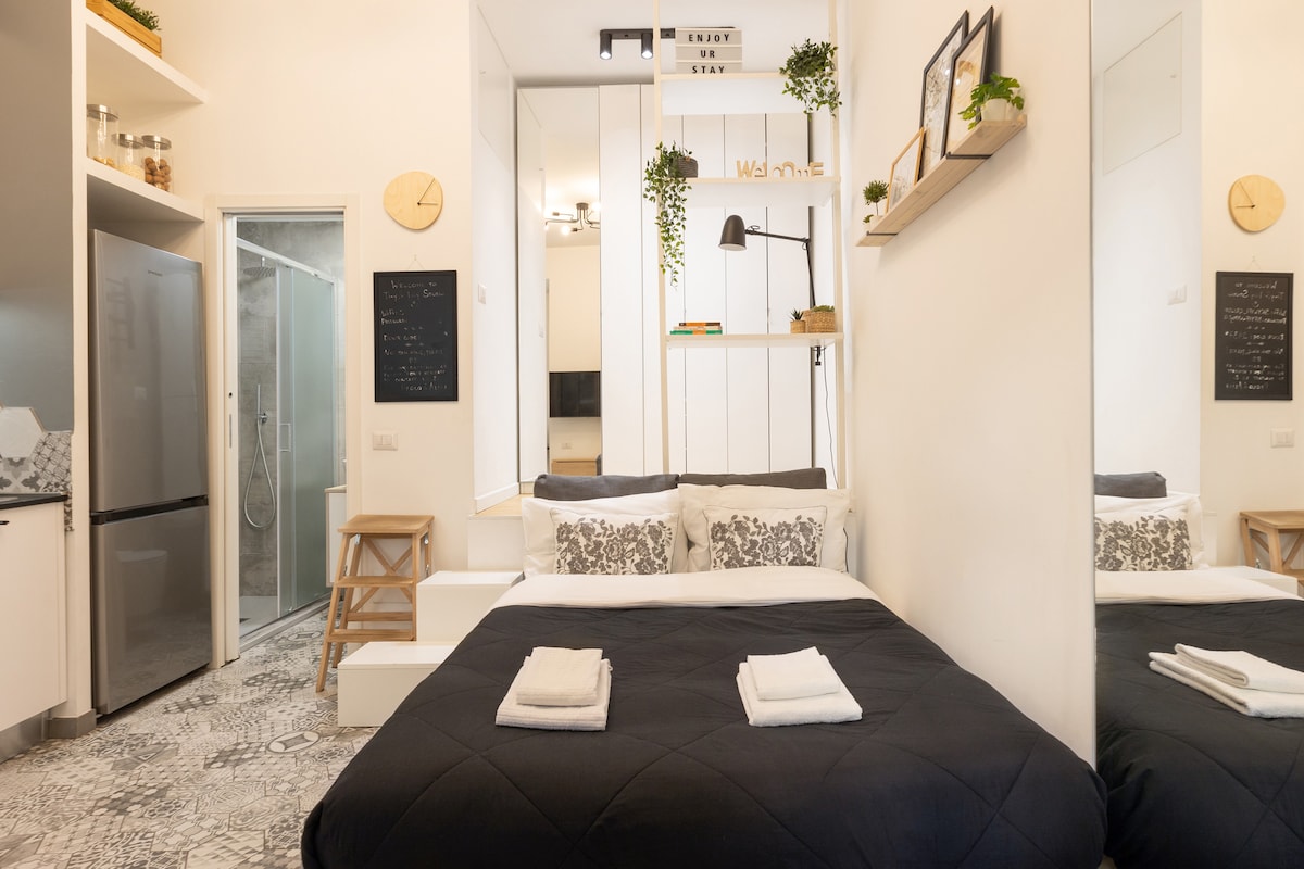Una particolare soluzione disegnata e studiata in ogni minimo dettaglio con oggetti di design. Adatta per due o quattro persone in due letti: uno matrimoniale standard da 160 cm e uno alla francese da 140. Siamo in centro nel vitale quartiere di Porta Venezia a ridosso dei Giardini Pubblici, vicino alla metropolitana rossa in direzione Rho Fiera, vicino alla linea gialla e vicino alla stazione centrale in una via tranquilla al piano terra con accesso diretto da strada.