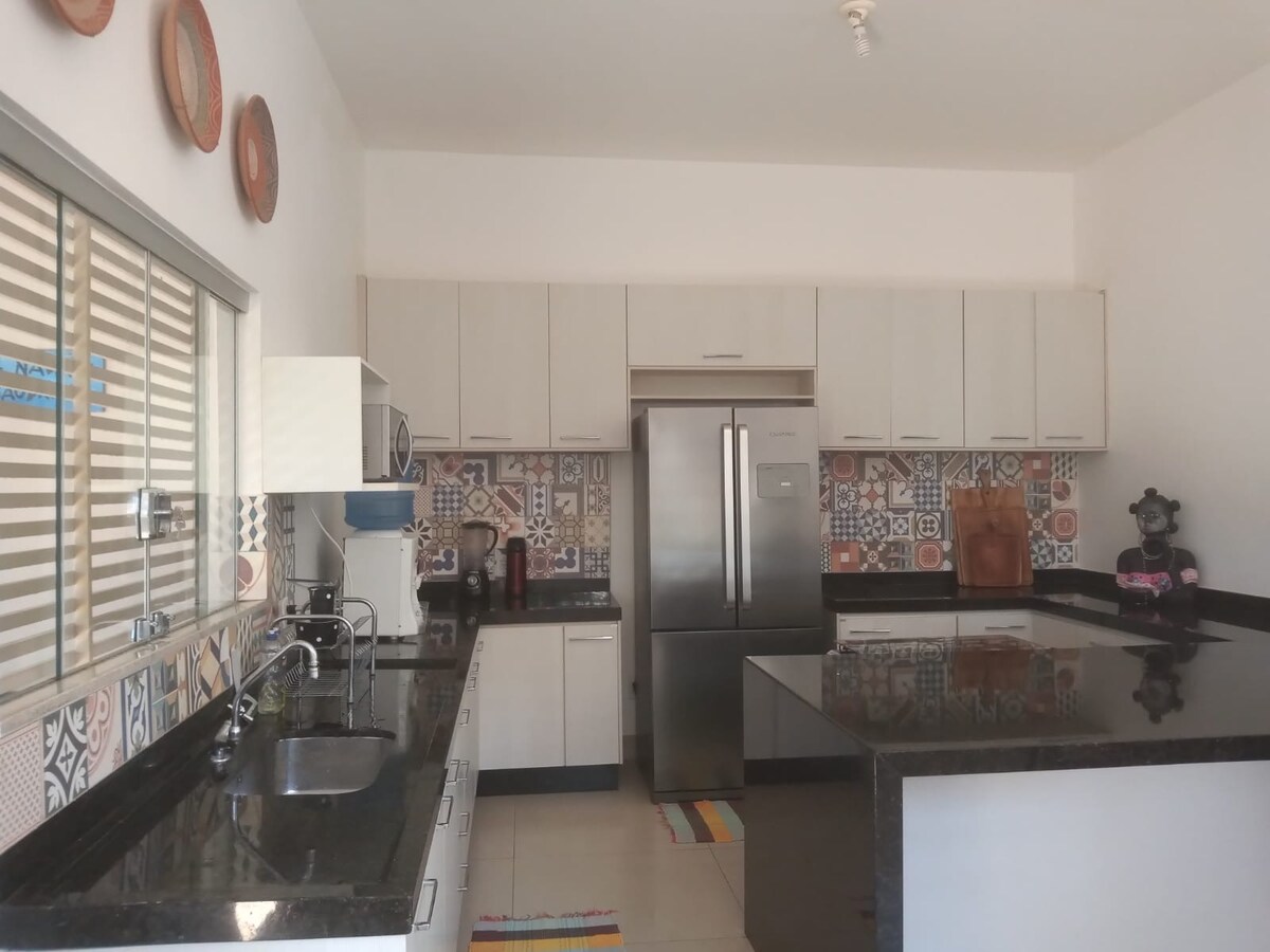 Pridite z družino ali poslovno – prostorna hiša v bližini parka Parque do Povo in tržnic, 3 minute od središča mesta Birigui in Regionalne bolnišnice, hiter dostop do avtocest, garaža z 2 parkirnima mestoma, elektronska vrata, zunanji nadzor in električna ograja. Popolnoma opremljena kuhinja, cvrtnik na vroči zrak, mikrovalovna pečica, hladilnik, čistilnik, balkon z žarom. Apartma: klimatska naprava, 2. spalnica: 2 enojni postelji, stropni ventilator, 3. spalnica: zakonska postelja in prenosni ventilator, dnevna soba: kavč in pametna televizija.