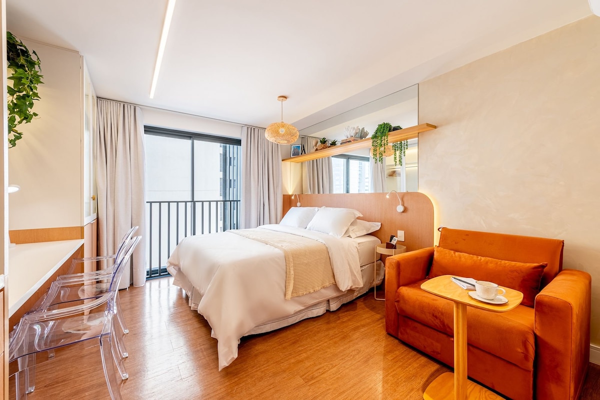 Estúdio moderno e acolhedor, decorado por arquiteta, em andar alto, com ampla vista da cidade, em região segura e tranquila. Ideal para trabalho ou lazer, possui Wi-Fi rápido, Smart TV, cama queen com black-out, sofá-cama, ar-condicionado, armários e cozinha funcional com frigobar duplex. Banheiro com toalheiro térmico, chuveiro potente e secador. Prédio com academia 24h, piscina térmica, rooftop e lavanderia. A 850 m do Parcão.