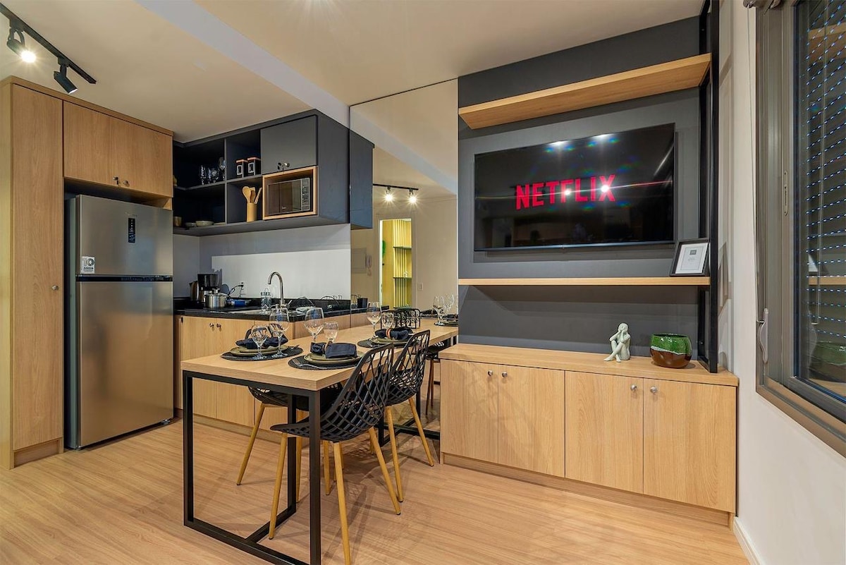Dobrodošli v našem očarljivem predelanem stanovanju, kjer se udobje in sodobnost srečata v udobnem 25m2velikem prostoru. To je popoln oddih za pare, prijatelje ali samostojne popotnike, ki želijo raziskati živahno regijo, ki pokriva soseske Moinhos de Vento, Auʻadora e Bela Vista, eno najbolj odličnih in trendovskih območij v Porto Alegreju. Novo in sodobno stanovanje z odlično infrastrukturo, ki je na voljo gostom: ogrevan bazen, telovadnica , terasa s čudovitim razgledom na mesto!