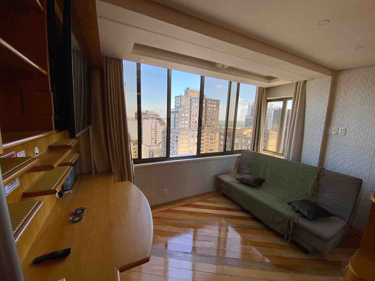 Kompakten apto s pohištvom po meri, v celoti prenovljen, opremljen z lučmi, LED, lestenci in obeski. Ima popolnoma opremljeno kuhinjo, poleg tega pa je gostom na voljo tudi posteljno in kopalniško perilo ter gospodinjske pripomočke (aparat za kavo, mikrovalovna pečica, opekač kruha, mešalnik, pečica, hladilnik, TV 80 cm z Netflixom, sušilnik za lase, šampon, balzam in milo.) Lokacija: ni na robu Guaíbe, vendar je mogoče imeti zelo lep razgled na stanovanje in teraso.