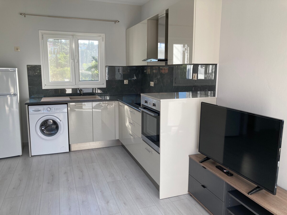 Fully renovated 80 sq m apartment in Potamos Corfu. Potamos is a suburb neighbourhood of Corfu Town just 5km from the city center. The apt is on the 1st floor of a 2 floor building, fully equipped for complete comfort. 2 separate bedrooms, living room with smart 4K TV (LG), Netflix, Wifi, fully equipped kitchen in a separate room with dining area, one large veranda with outdoor dining area and a smaller balcony accessible from the bedrooms with a seating area for breakfast with a sea view.