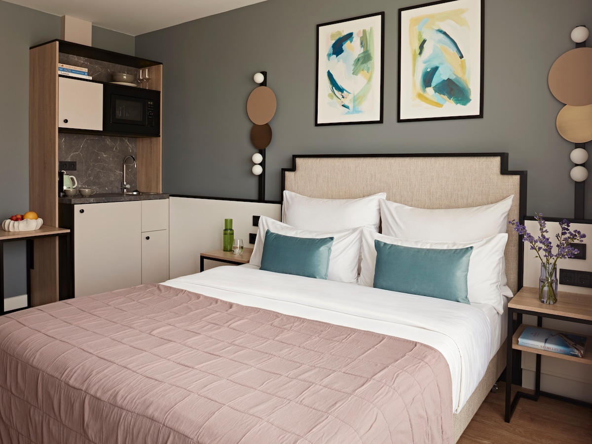 Oddih v mestu ali daljše bivanje? Z vsem, kar potrebujete za življenje, so ti elegantni studii velikosti 22 m² pametno zasnovani in vključujejo naravne teksture in edinstvene zaključke. Imeli boste udobno zakonsko posteljo velikosti 150 cm x 200 cm v Združenem kraljestvu, pisalno mizo za delo, kuhinjsko nišo za enostavno kuhanje in sodobno kopalnico. Imate perilo? Skupno perilo lahko uporabljate, kot želite. Izjava o omejitvi odgovornosti: stanovanje na sliki morda ni tisto, v katerem boste bivali.