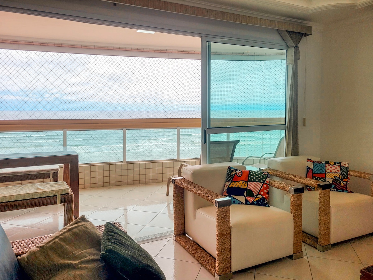 Sodobno stanovanje na plaži Aparecida. Odlična lokacija, stavba pred plažo, v bližini barov kanala 5 in nakupovalnega središča Praiamar. V visokem nadstropju, z delnim pogledom na morje, na 3 balkonih. Dobro opremljena kuhinja (plinski žar, mikrovalovna pečica, električna pečica, kuhalna plošča, pivovarna, vinska klet, kavni aparati in pomivalni stroj). Kopalnica za druženje. Suita z zakonsko posteljo (Queen), masažno kadjo in kopalnico. Spalnica z 2 zakonskima posteljama. Na voljo je vzmetnica/kavč. Pralnica s strojem. Klimatizirano.