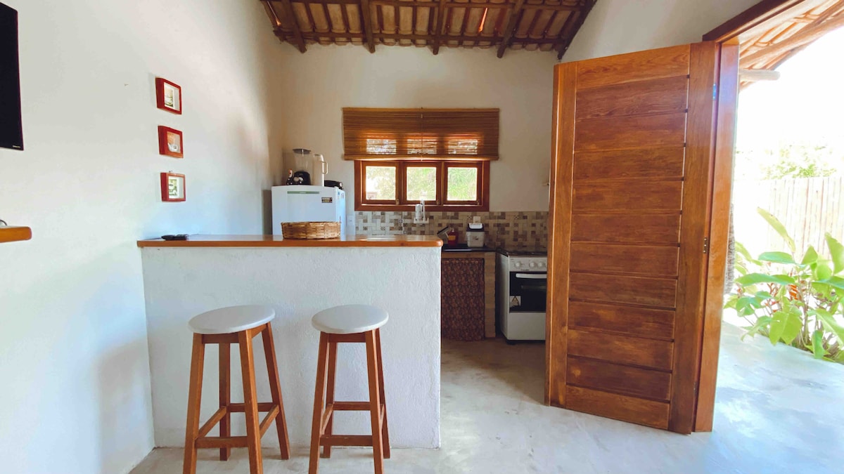 1 spalnica bungalov z 1 zakonsko posteljo in enojnimi vzmetnicami, klimatsko napravo, stropnim ventilatorjem in zatemnitvenimi zavesami. Posteljnina in brisače niso vključene. Povezana soba s škatlo in vzmetnico, stropnim ventilatorjem, televizijo s pretočno storitvijo in internetnim signalom s kablom in omrežjem Wi-Fi . Kuhinja s hladilnikom, štedilnikom, mikrovalovno pečico, aparatom za sendviče in drugimi pripomočki. Bungalov ima balkon z visečo mrežo za vaš počitek in prostor za žar.