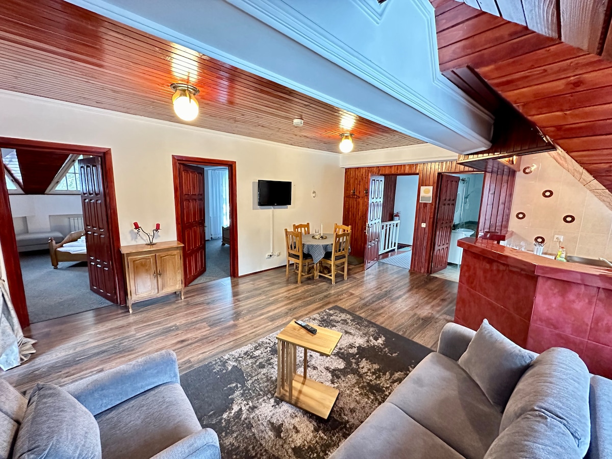Our chalet offers a relaxing and comfortable getaway. The space features a cozy living room, a bedroom, a bathroom, and a fully equipped kitchenette. Step outside to the terrace, where you can enjoy beautiful views of the mountains. Perfect for couples or small families, this charming chalet provides a peaceful escape with easy access to nature and adventure.