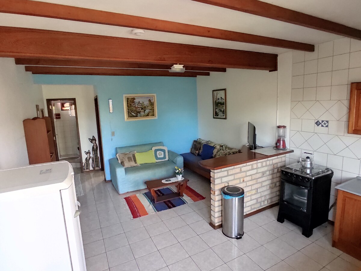 As kitnets têm cozinha compacta, equipada com fogão de 2 bocas, geladeira e utensílios básicos. Possuem beliche e cama auxiliar embaixo, e subindo as escadas, uma suíte casal com ar condicionado e SmartTV.