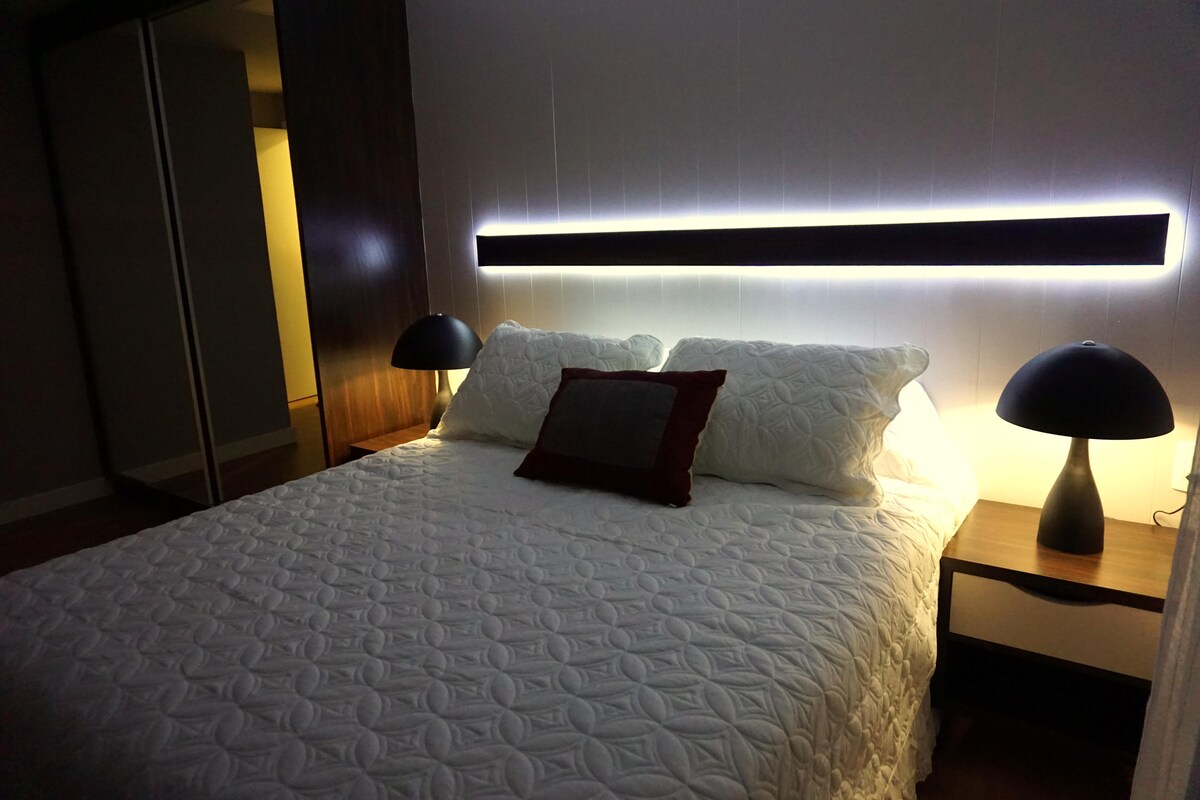 Naše prenočišče je zasnovano tako, da boste imeli veliko udobja in udobja pri skrbi za goste. Stanovanje 401 je luksuzno stanovanje s površino 38 m² in velikim balkonom s pogledom na kanal Itajuru. Od gastronomskega centra je 100 mts z več restavracijami,bari z živo glasbo in 700 mts Praia do 🏖️ Forte. Zdaj ima pokrito parkirišče, ki je vključeno v samo stavbo.