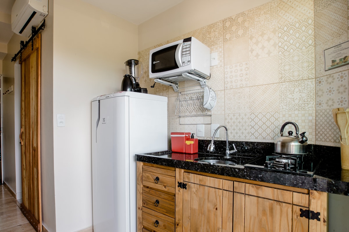 Stanovanje z zasebnim in ogrevanim jacuzzijem, visečo mrežo in čudovitim pogledom na morje na balkonu! 1 spalni prostor, kuhinja (štedilnik, hladilnik, mikrovalovna pečica, aparat za kavo, opekač kruha in osnovni pripomočki), kopalnica in raztegljiv kavč v dnevni sobi. Na voljo je 1 brezplačno parkirno mesto. Namestitev ima veliko teraso, žare in bazen (skupno). Nahaja se v mirnem predelu. Blizu smo plaž: Sepultura, Lagoinha e Retiro dos Padres (5 minut hoje). In približno 15 minut hoje od Centro de Bombinhas.