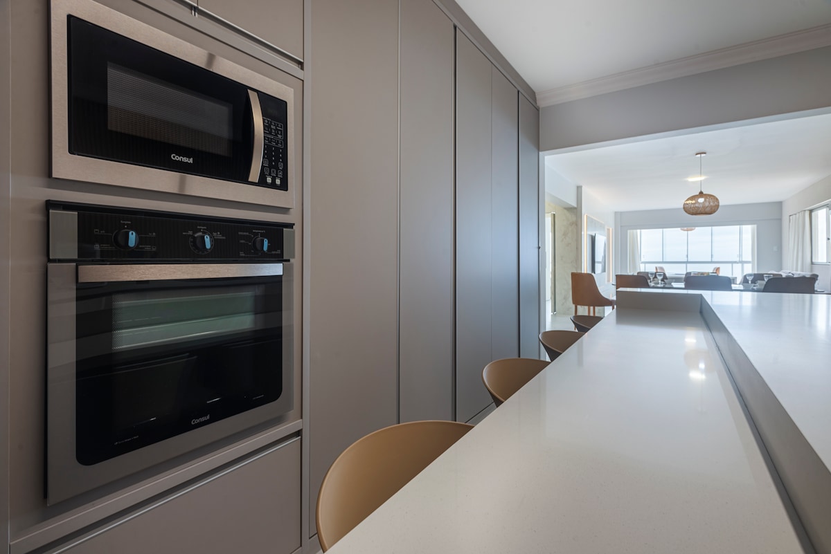 Celotno stanovanje s 3 spalnicami (2 suiti +1) s panoramskim razgledom in privilegirano lokacijo ob morju plaže Cabeçudas. Velik in udoben prostor je bil pripravljen in opremljen za sprejemanje gostov z udobjem in priročnostjo: dvojna postelja, Wi-Fi, pametna TV 50'', polna kuhinja, plinska prha, pralni stroj, zasebna garaža in balkon z gurmanskim prostorom. Idealen kraj za sprejem družin in parov. Uživajte v spektakularnem razgledu in mirnih vodah najbolj očarljive plaže v Itajaíju!