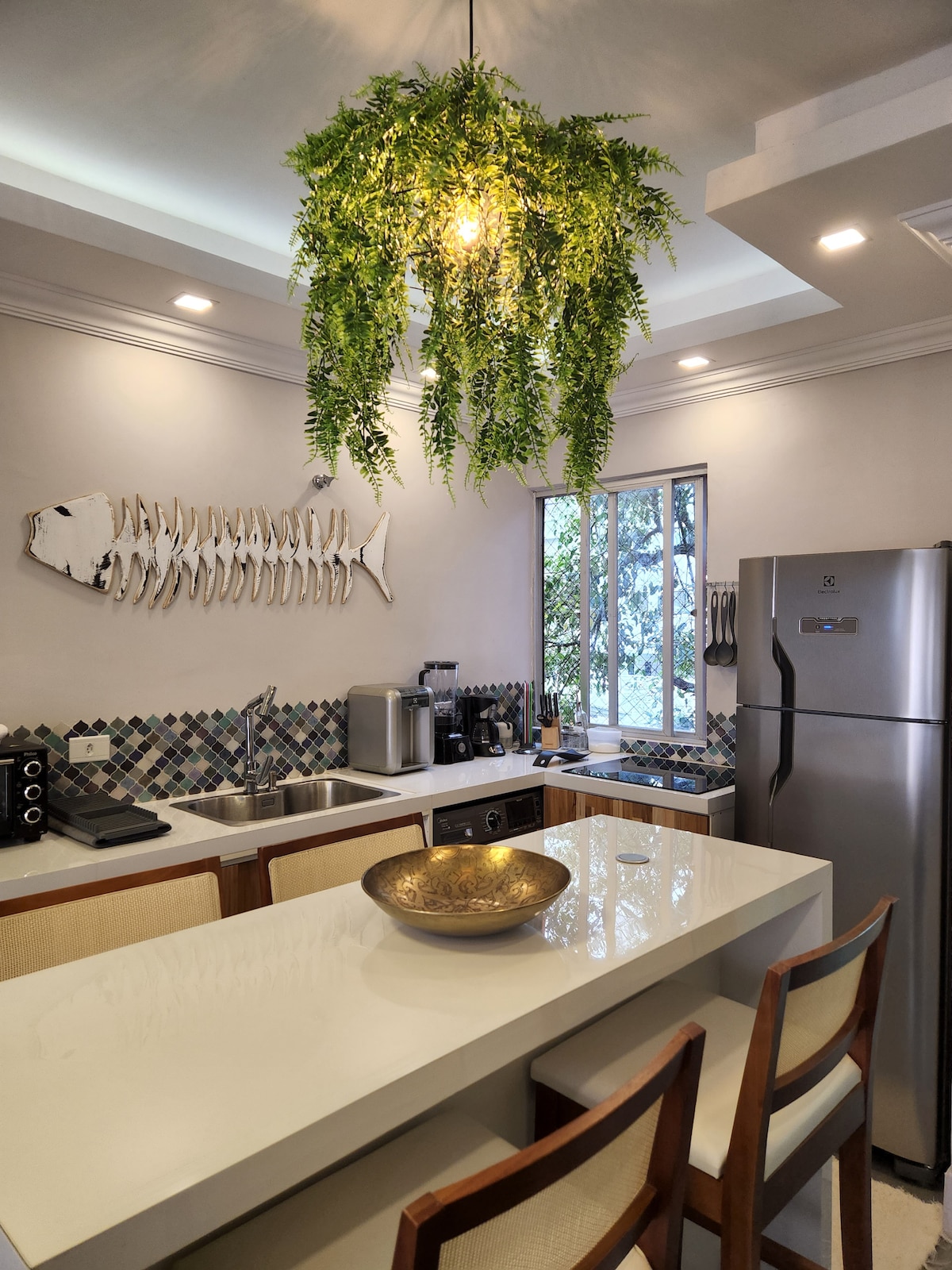 Apartamento na cobertura, a 900 metros da Praia de Caiobá e a uma quadra da Avenida JK, em prédio com apenas 2 unidades. Ideal para casais e famílias que buscam conforto e praticidade: suíte com cama king e colchão extra, sala de estar com sofá-cama, Smart TV e Wi-Fi, cozinha equipada com churrasqueira e ar-condicionado, terraço com espreguiçadeiras para curtir o pôr do sol. Acomoda até 6 hóspedes, com mais conforto para 4 pessoas. Roupa de cama incluída, vaga de garagem coberta e pet friendly.
