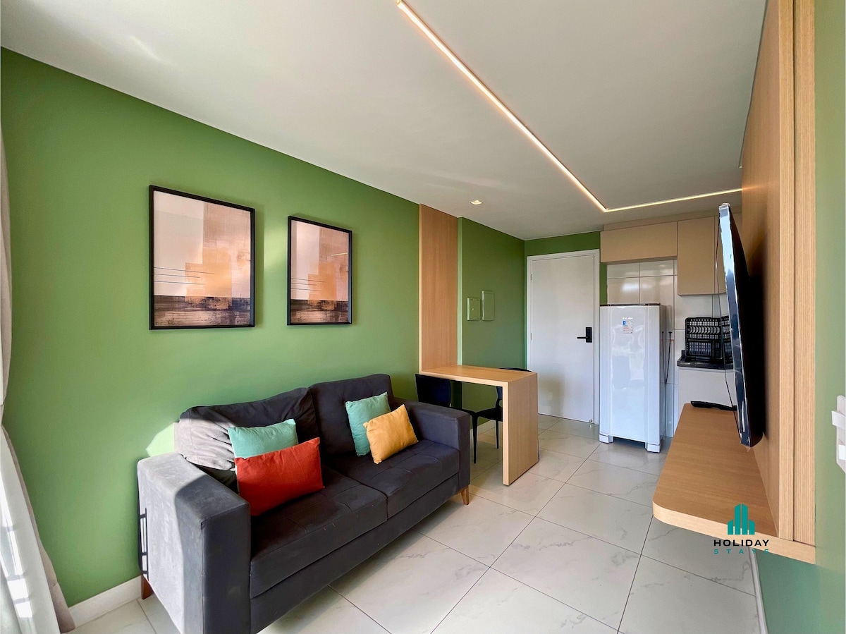 Apto studio style (integrirane sobe) s pogledom na morje, lastna ETT, 1 zakonska postelja in 2 enojni postelji, grelnik vode, omrežje Wi-Fi, pametna 55-palčna televizija, varnostna mreža za balkon, sušilnik za lase, mikrovalovna pečica, cvrtnik, aparat za kavo, pralni stroj itd. V skupnih prostorih imamo telovadnico, tržnico in bazen s spektakularnim razgledom. Blizu znamenitosti ( Ponte dos Ingleses, osrednja tržnica itd.), supermarketov, lekarn, barov in restavracij. 100 m od bodoče Casa Cor.