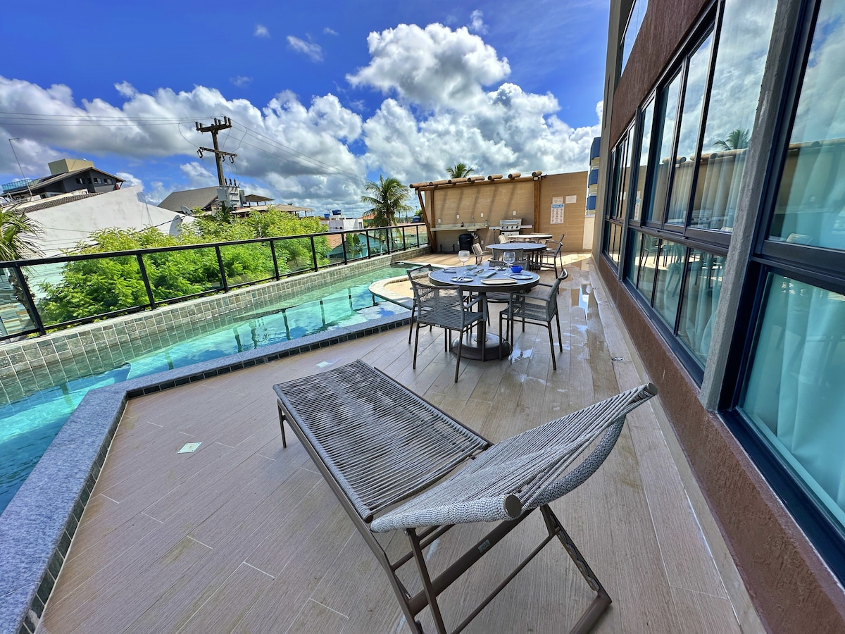 -> Enxoval completo (Cama e Banho). -> Atendimento do anfitrião 24h. ☆ Piscina Privativa com vista mar. -> Portaria 24h. -> Estacionamento interno gratuito Venha desfrutar de Porto de Galinhas da melhor forma! Flat beira-mar, com uma excelente área de lazer, juntamente com a piscina de uso exclusivo do flat. O condomínio possui áreas de lazer completas, como o rooftop, que conta com churrasqueira, piscinas e guarda-sóis, além de uma vista panorâmica para a praia.