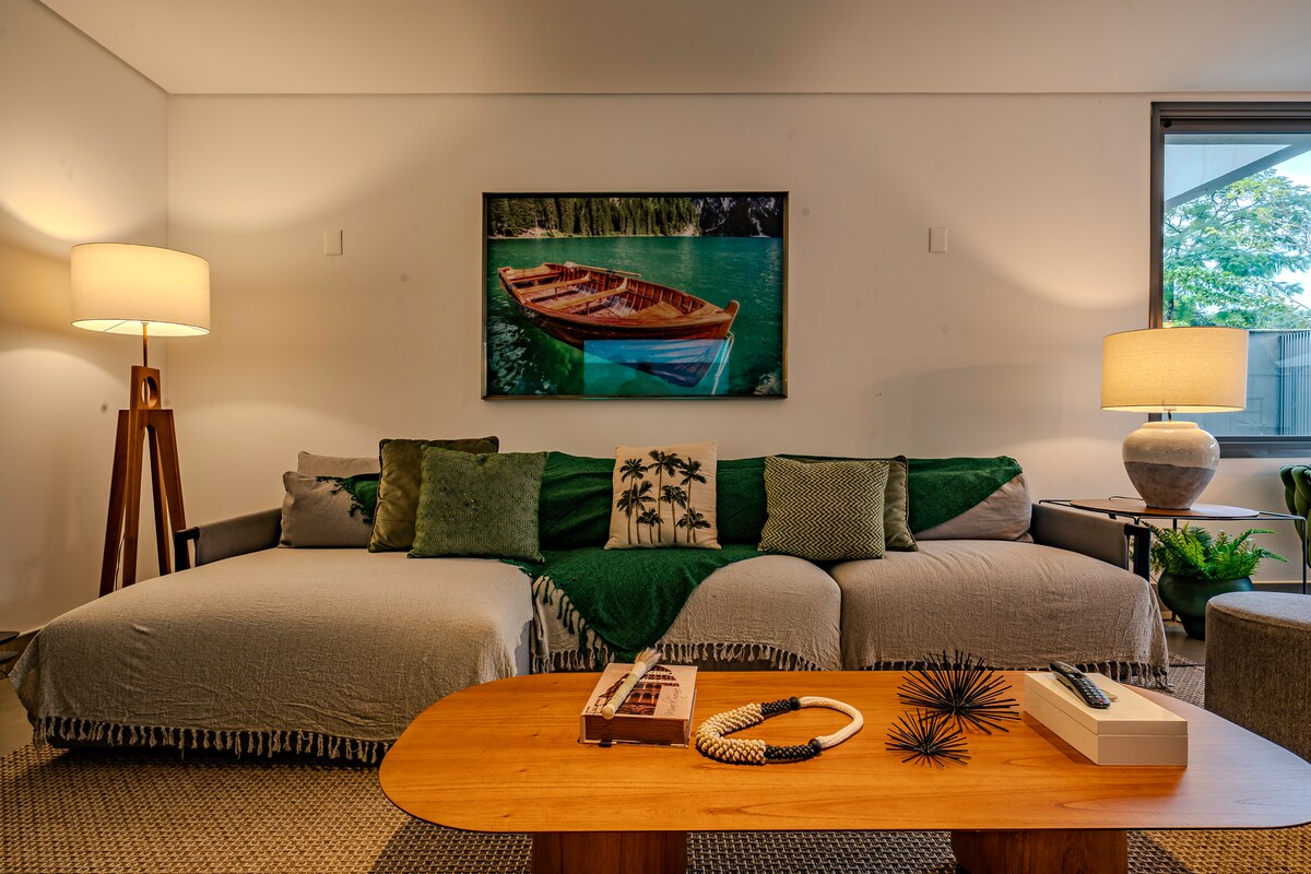 Počutite se, kot da ste bili na ladji, le 1h od mesta São Paulo: zvoki valov, ptice in spektakularna pokrajina s pogledom na morje in morske želve. Nahaja se v prefinjenem stanovanju z bujno naravo, v najboljši plaži v Guarujá. Apartma šteje z velikim balkonom za dnevno sobo in spalnice, in je pripravljen ponuditi edinstveno doživetje bodisi za sprostitev in/ali delo - visoko hitrost wi-fi, klimatsko napravo, pametne televizorje in domačo pisarno. Bazeni s pogledom na morje, telovadnica, prostor za žar. Storitve na plaži.