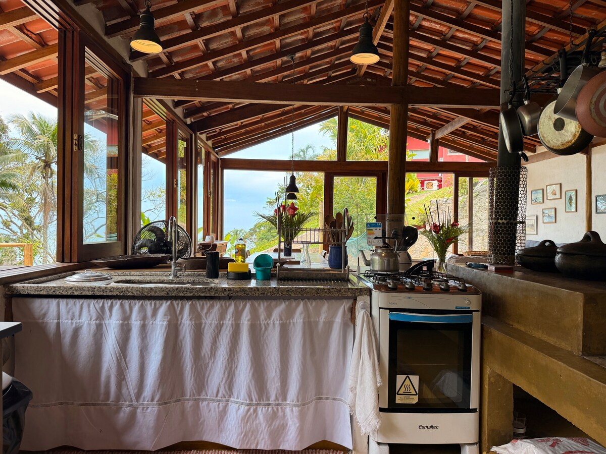 a casa fica em meio a Mata Atlantica, com uma vista incrível, de todos os ambientes da casa, inclusiveda suíte redonda de vidro, voce tem a vista do mar e ilhas e ainda conta com um barulhinho da cachoeira para dormir a casa possui uma suíte de vidro redonda e 2 varandas na parte superior, na parte de baixo lavabo, sala, cozinha completa e deck externo