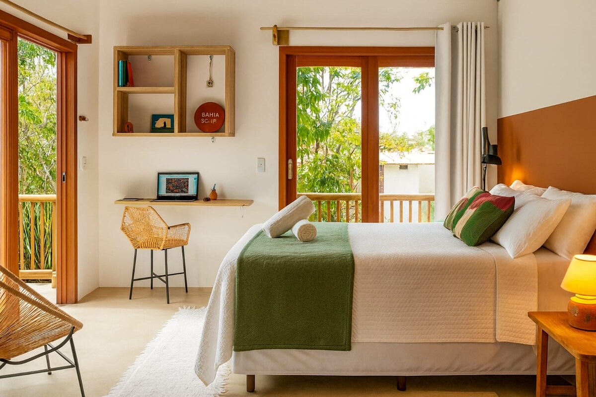 Private house beautifully designed to capture the essence of Trancoso, 3000 sq mt of lush garden, a maid is included in the price. House has fiber optic 500 MB max speed, its 10 minutes drive to famous Quadrado and 10 minutes walk or 5 mt by car to the beach Rio da Barra through a private path, a short cut. Luxury linens and towels provided. Beach umbrellas and chairs.