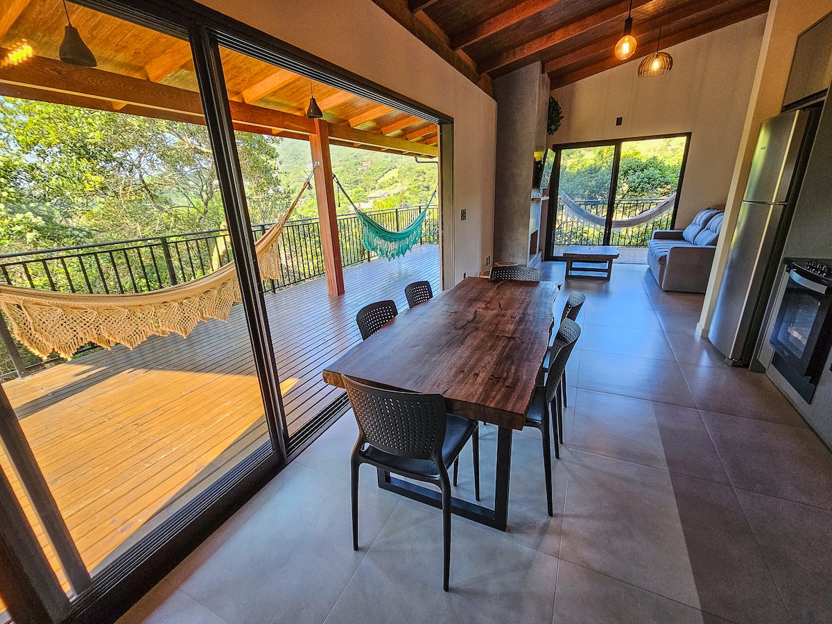Casa com muito estilo e uma vista de tirar o fôlego! Para quem busca as melhores experiências, conforto, sofisticação, segurança e tranquilidade! Três suítes + Suíte Master com cama King size, lareira de etanol, frigobar e banheira de hidromassagem. Spa aquecido no deck, mesa de sinuca, ar condicionado em todos os quartos e sala, wifi, churrasqueira interna e externa, adega, cervejeira, lava louça e lava roupas. Adoramos Pets, porém não permitimos cachorros de grande porte.