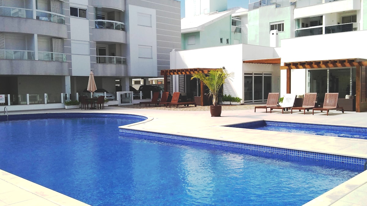 Apartamento novo, condomínio de alto padrão +ou-100 metros do mar, bloco A de frente para a piscina de borda infinita. A sacada do apartamento possui churrasqueira e uma vista incrível da praia dos Ingleses. Móveis sob medida. Dois quartos climatizados, sendo 1 suíte com TV Smart.Dois Banheiros com aquecedor a gás, proporcionando um banho relaxante. Sala com televisão Smart permite acesso a Netflix. Cozinha completa. Área de serviço com máquina de lavar e secar roupas. Garagem para 2 carros.