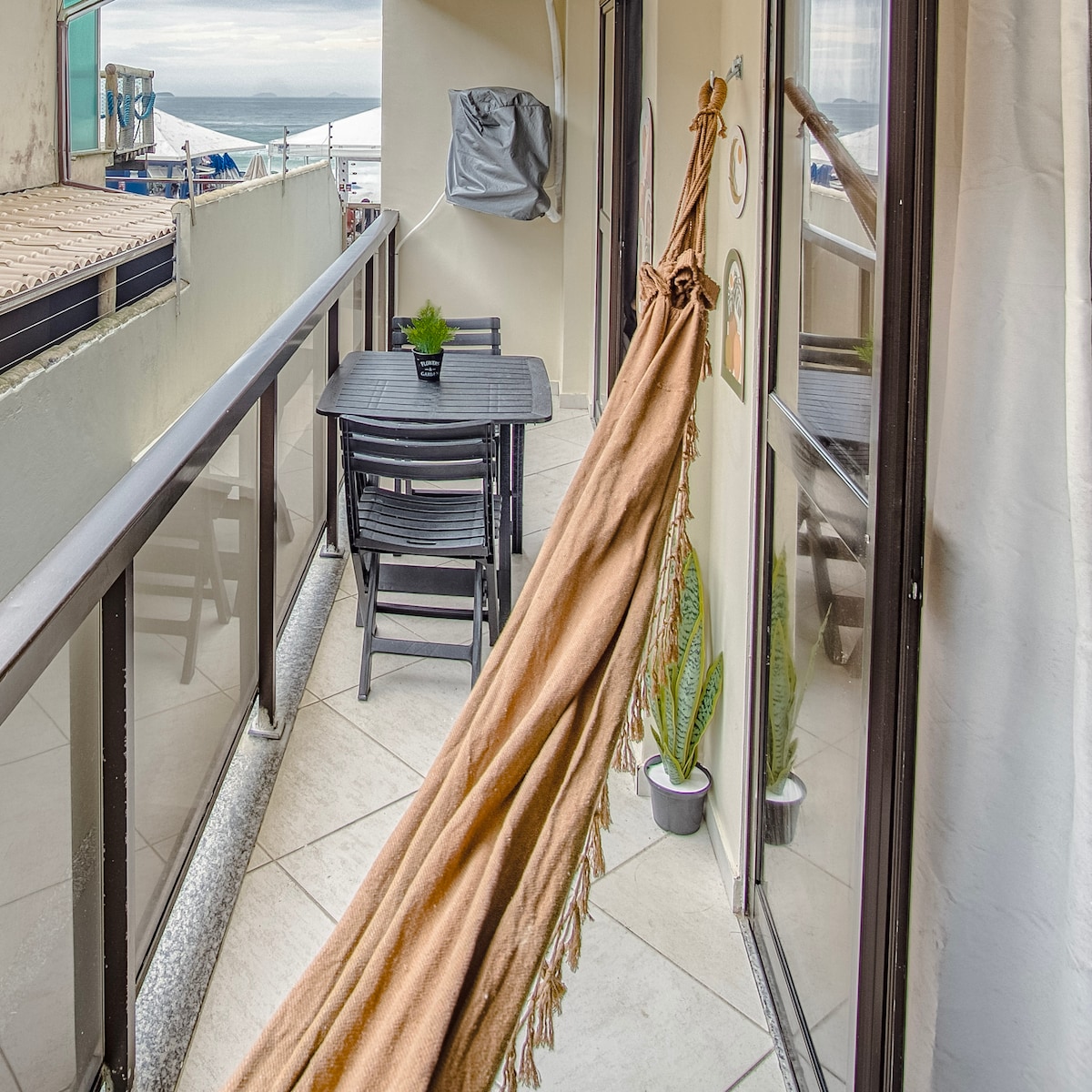 Apartamento tipo Flat, com 1 quarto com TV, wifi, ar condicionado, cozinha equipada com fogão elétrico de duas bocas, forno elétrico, micro-ondas, air fryer, geladeira e todos os utensílios para quem quer fazer uma refeição rápida. O condomínio possui piscina, uma linda vista p/a praia do Peró. Ótimo para quem gosta de comodidade para aproveitar as melhores praias de Cabo Frio: Peró, Conchas e Japonês. O condomínio fica em frente a praia. Pé na areia!