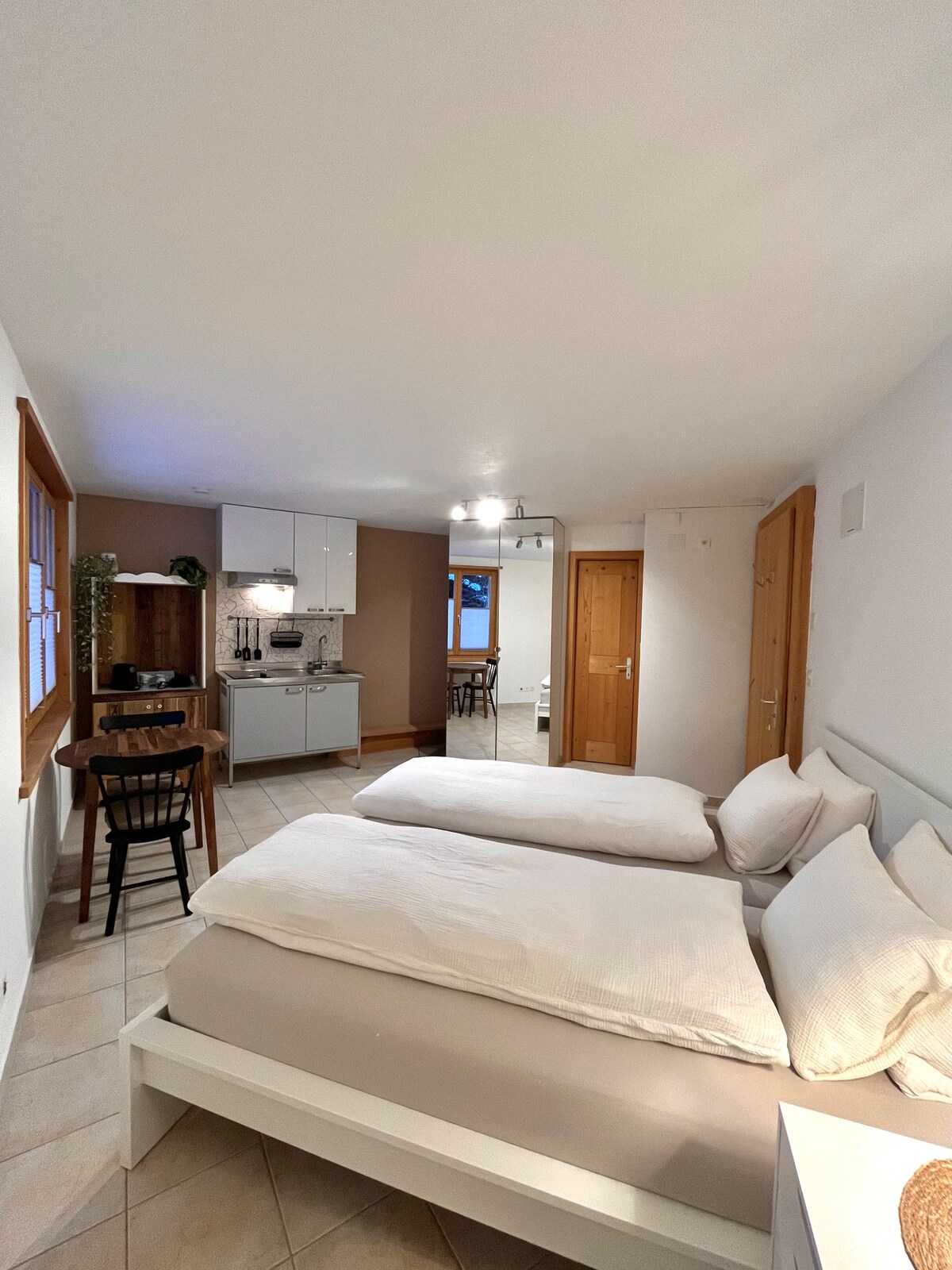 Udobno dvosobno stanovanje 36 m2 z ločenim vhodom. Spalnica se nahaja na poševni strehi v drugem nadstropju postelje z dvema vzmetnicama 1,80m x 2 m. Raztegljiv raztegljiv kavč za še eno osebo se nahaja v dnevnem/kuhinjskem prostoru. Wi-Fi, parkirišče je vključeno v ceno. Dodatni stroški, ki jih je treba plačati v gotovini na lokaciji Turistična taksa: 5,50 na odraslo osebo/noč, 2,60 na otroka/noč (6–12 let). Ugodnosti kartice za goste, brezplačna uporaba vlaka in avtobusa iz Küblisa – Davos.