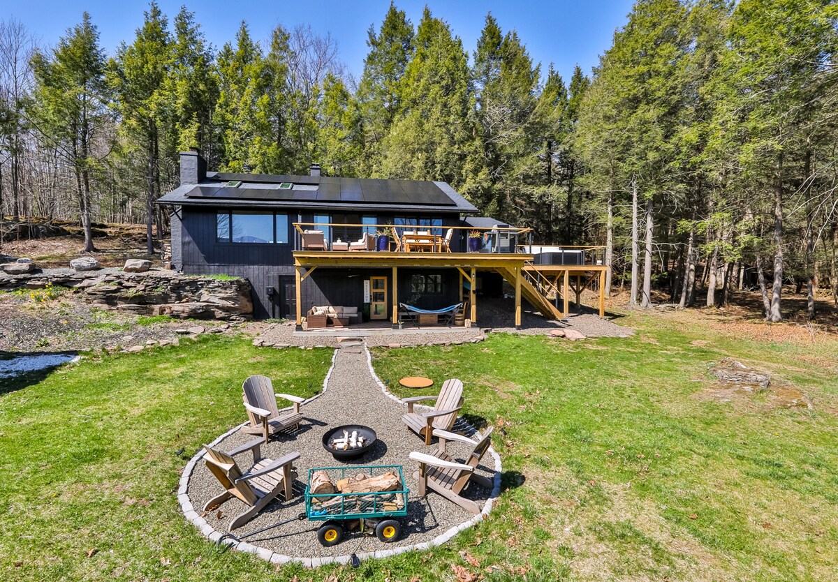 Na 12 hektarjih zasebnega zemljišča vas čaka čudovit oddih. Če imate raje sproščujoče počitnice ali če se želite vključiti v lokalne dejavnosti (pohodništvo, kolesarjenje, plavanje, smučanje, krpljanje, sankanje), je to vaše bivališče. Uživajte v 360-stopinjskem razgledu na gorovje Catskill s skoraj kjerkoli v namestitvi. Pijte jutranjo kavo, medtem ko opazujete sončni vzhod na veliki terasi. Igrajte se na velikem zasebnem dvorišču. Jasni večeri so najboljši za sončne zahode, ognjišče in opazovanje zvezd.